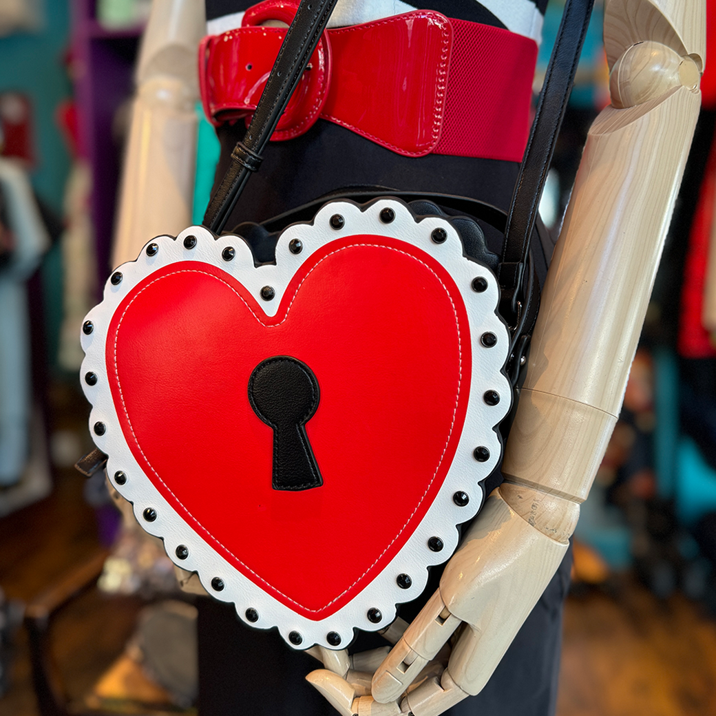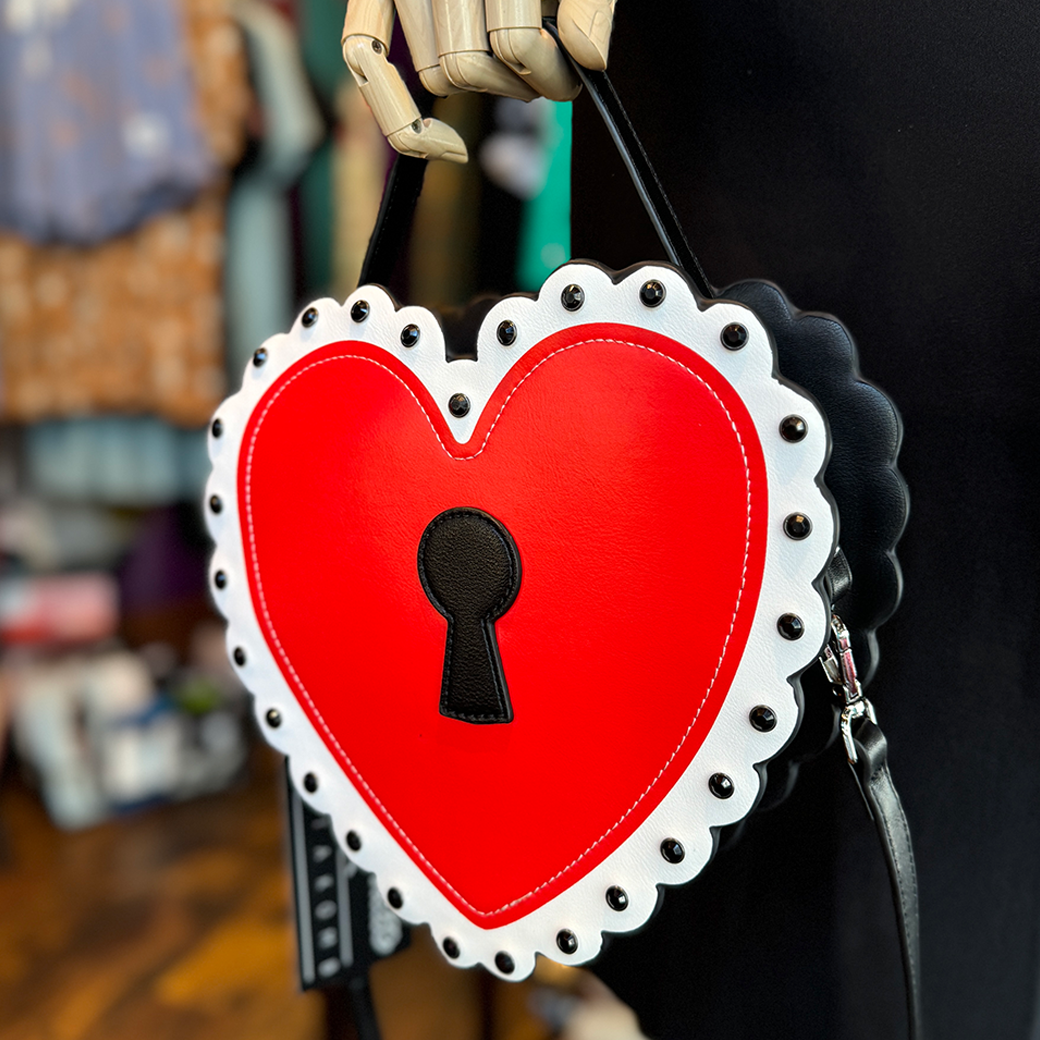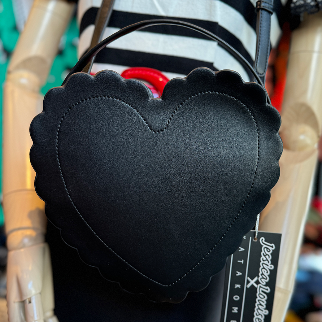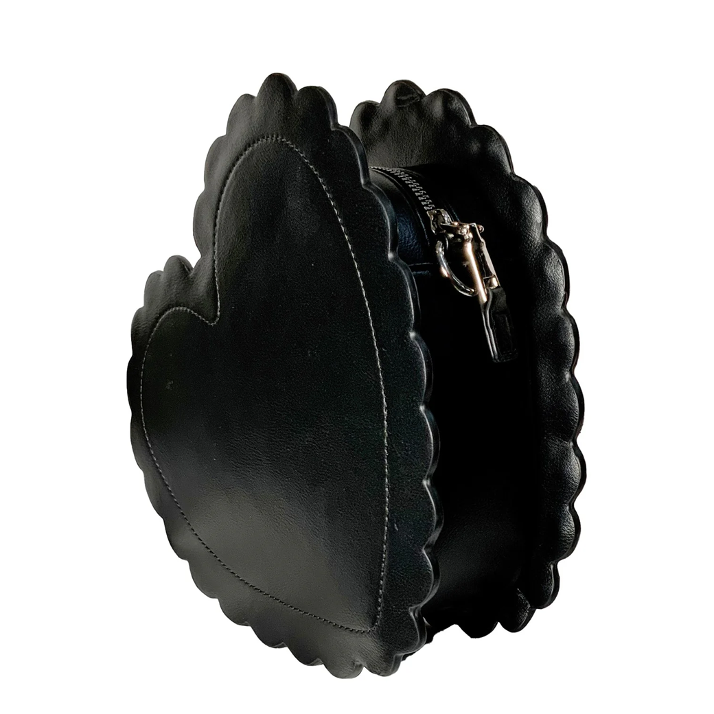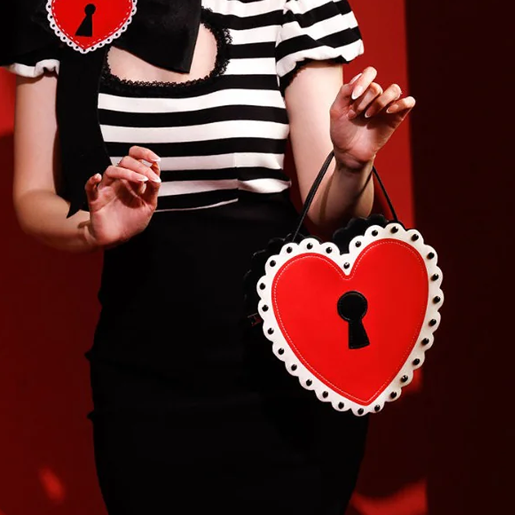 ヴィンテージのバレンタインカードからインスピレーションを得たハートロックデザインにホワイトのスカラップの縁取りとブラックのジュエルスタッズをあしらったバッグはコーディネートに魅力的なインパクトをプラスしてくれます。