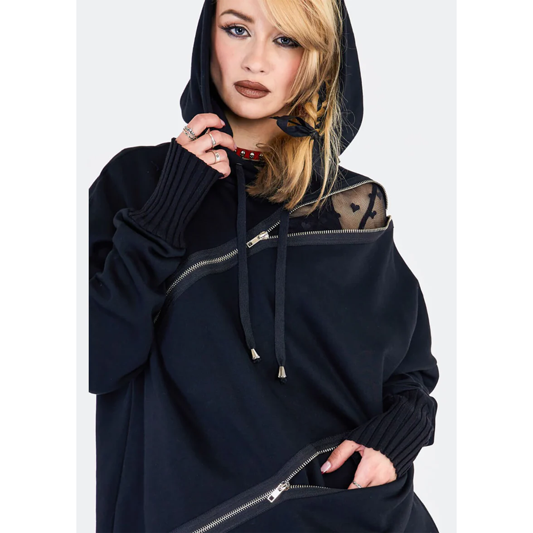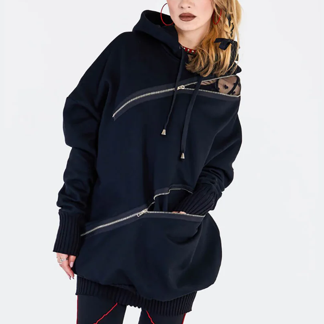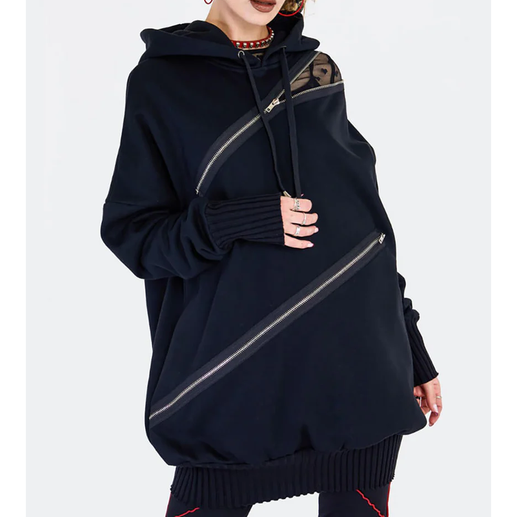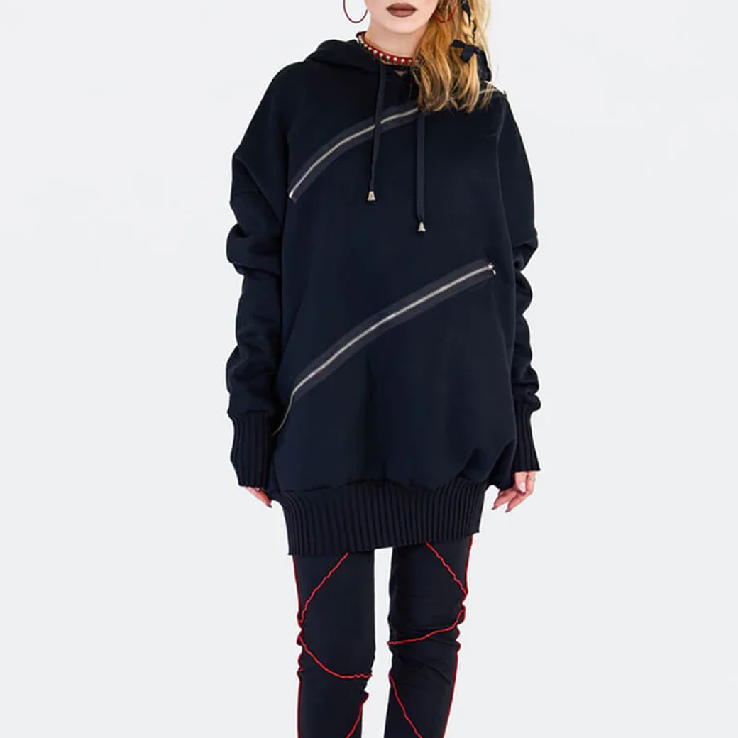 フロントの大胆な斜めジッパーをあしらった遊び心のあるブラックフーディー