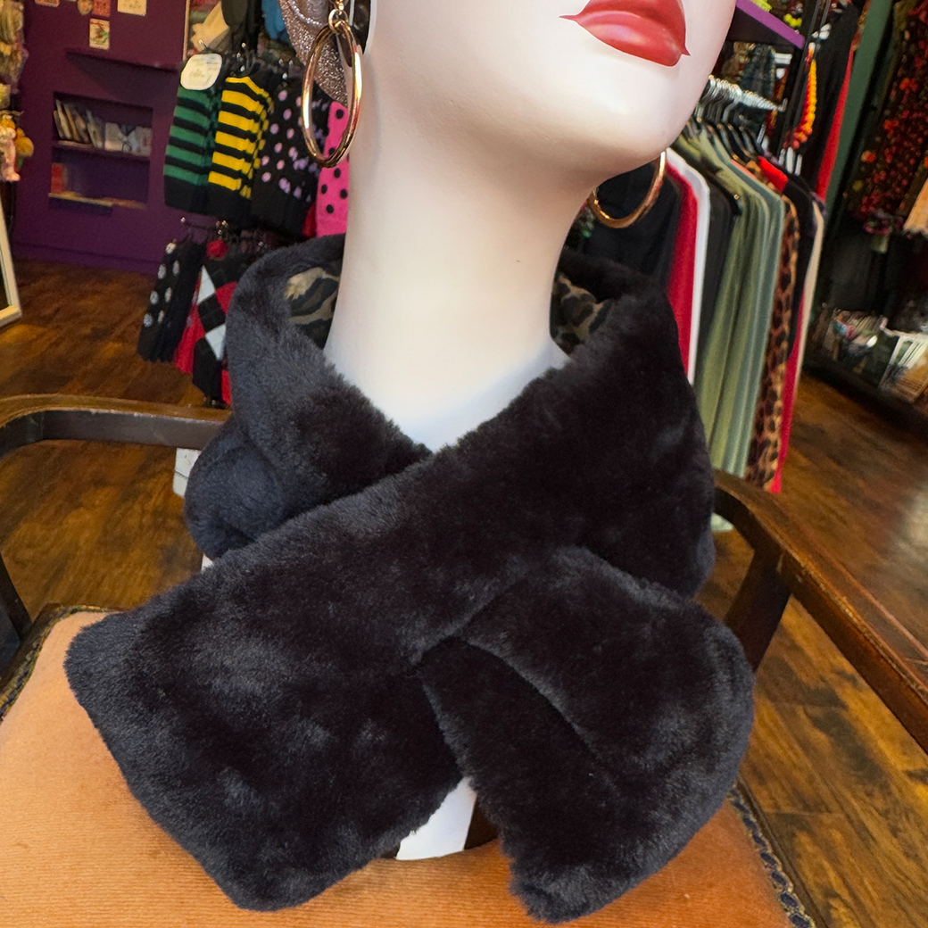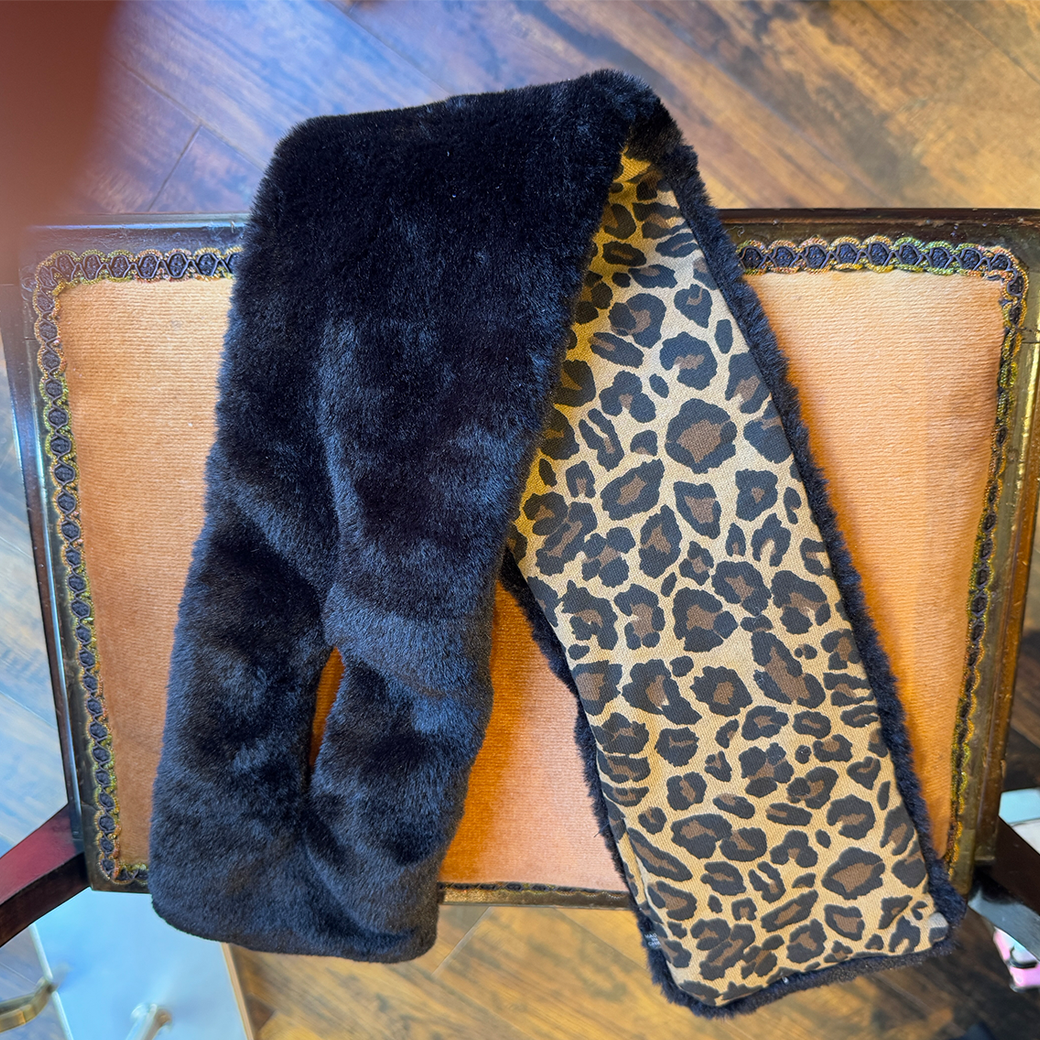 【VALLERY'S SELECT】Black Faux Fur Scarf -Leopard print lining