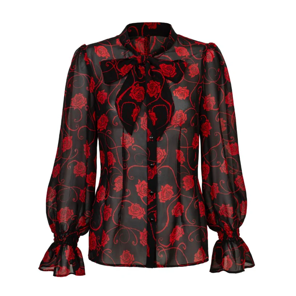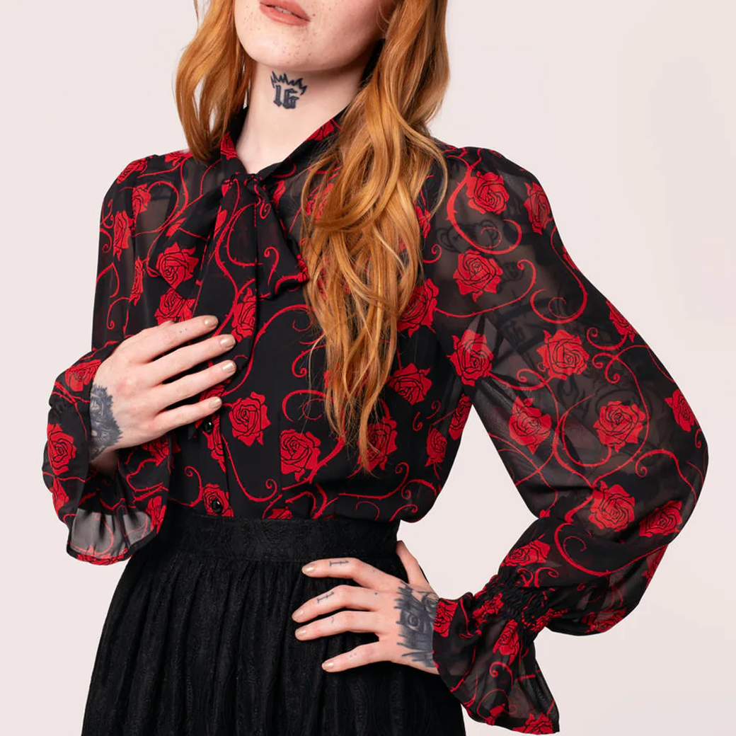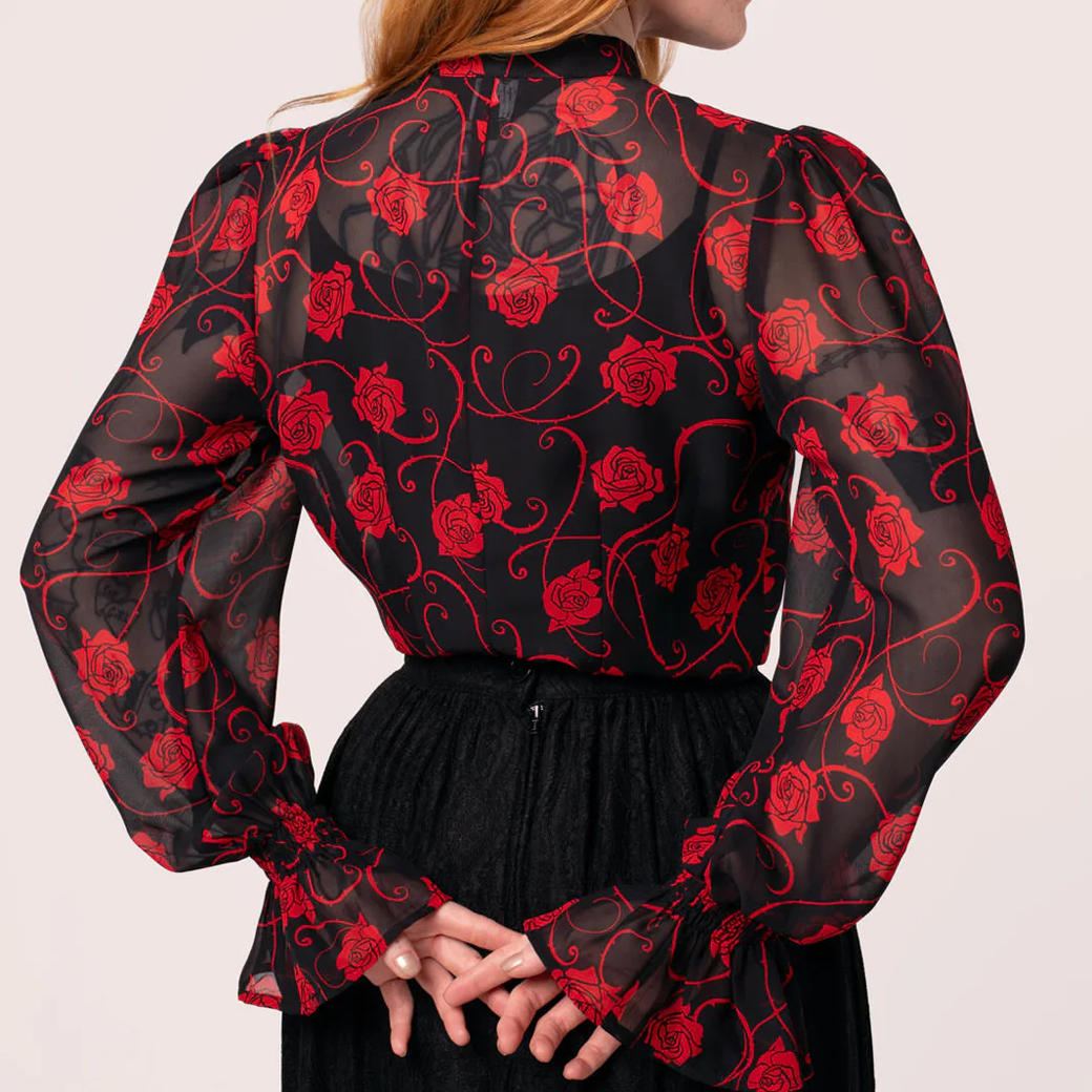 滑らかなブラックのシフォン素材に赤いバラとトゲのある蔦の繊細なプリントが映えるシアーブラウス