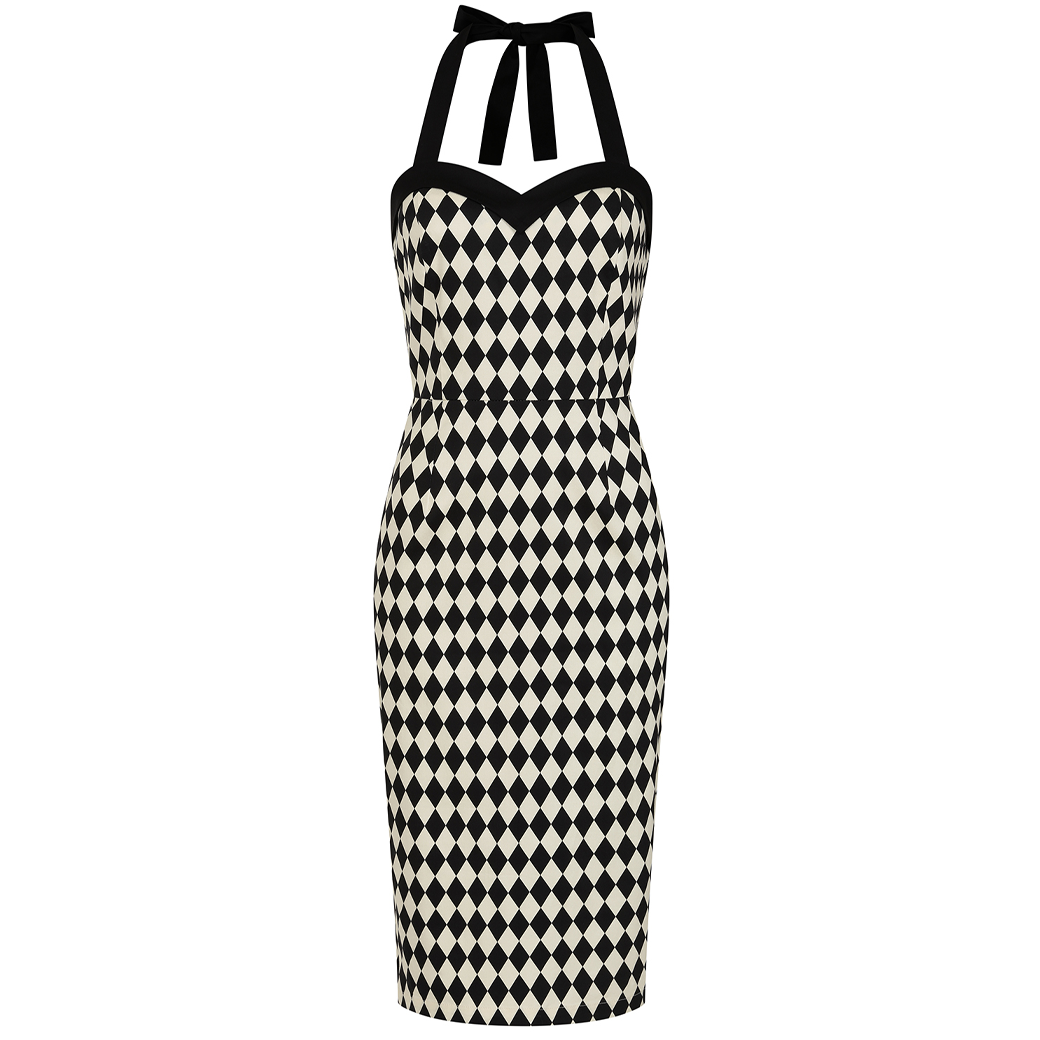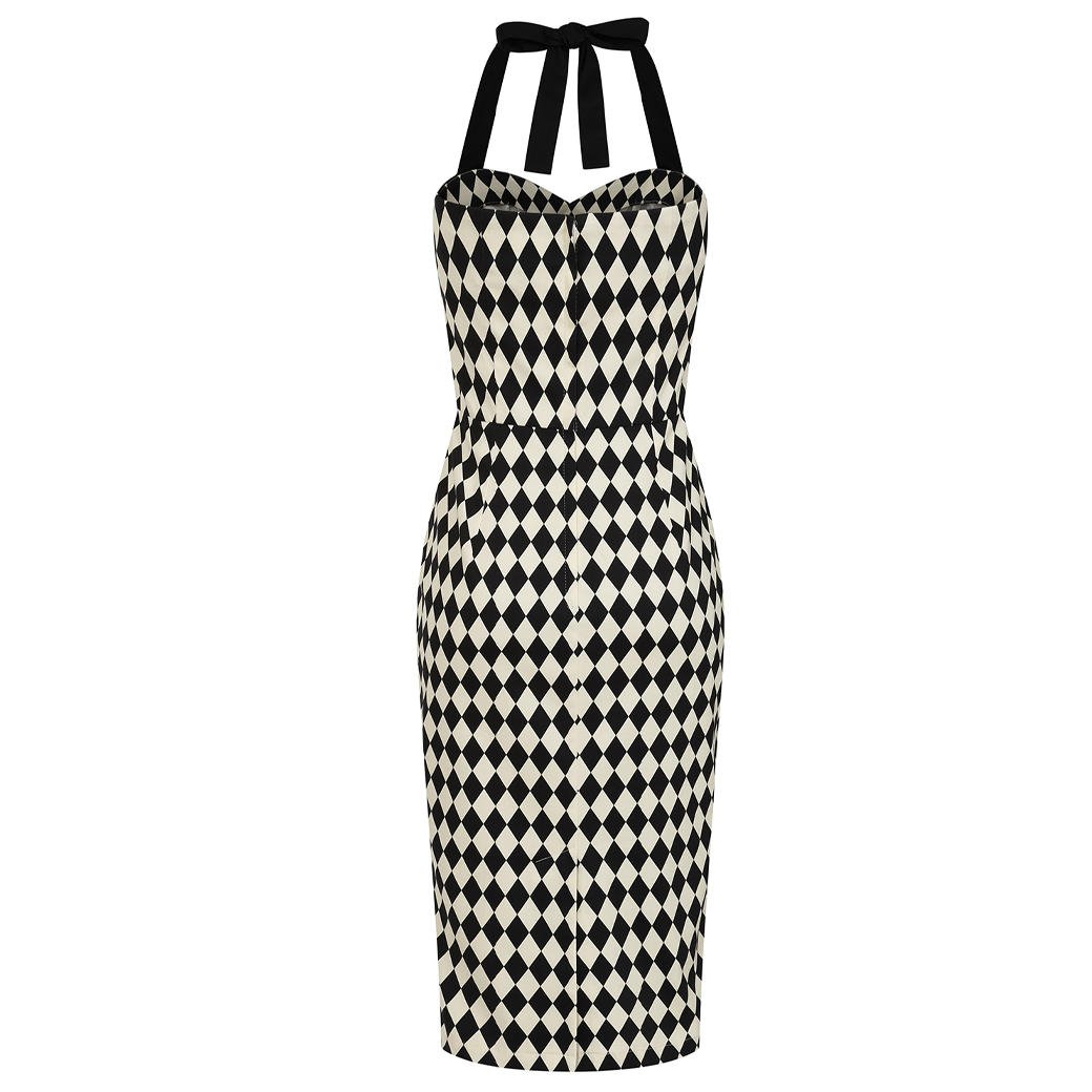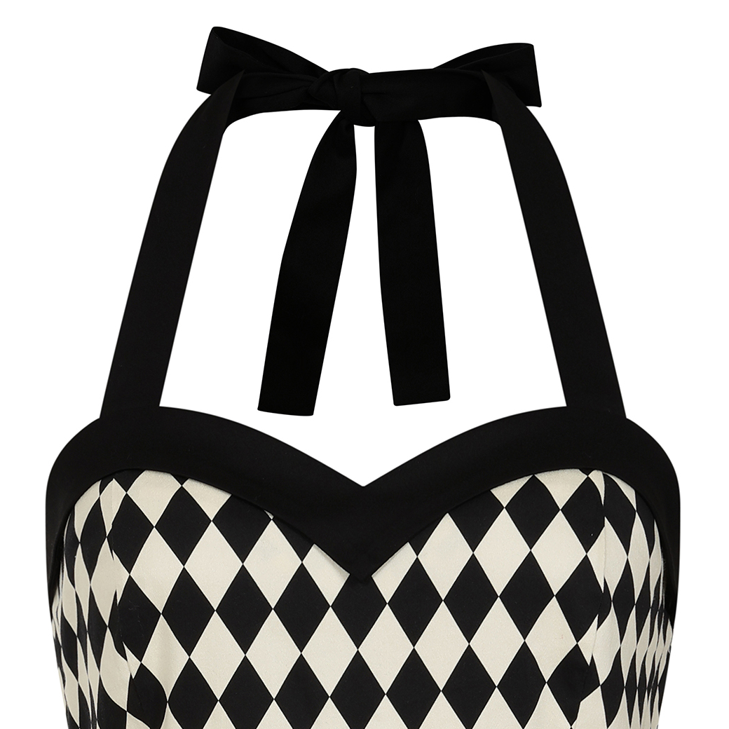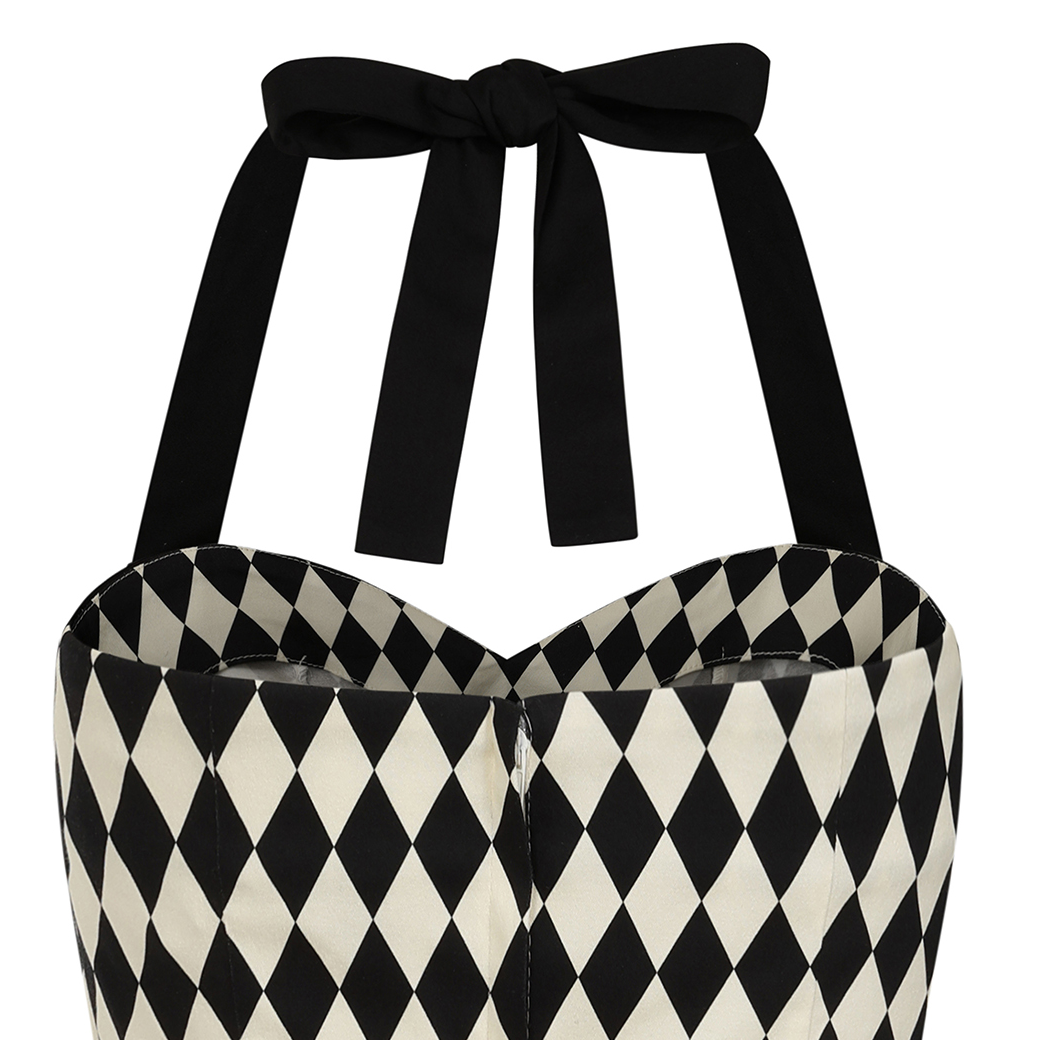 ヴィンテージスタイルに遊び心とインパクトをプラスしてくれるモノトーンのハーレクイン柄ホルターワンピース